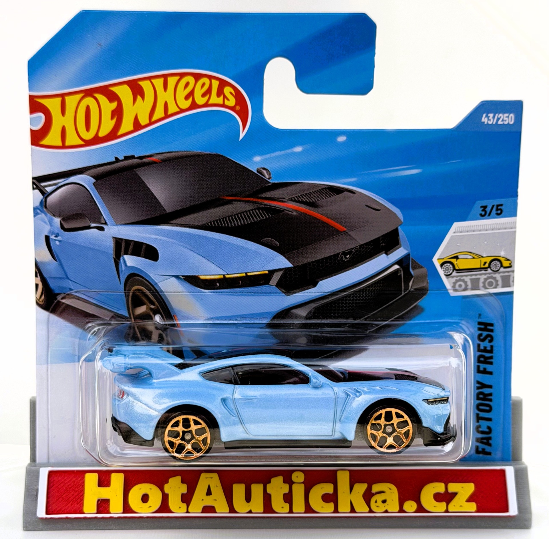 Nové sběratelské autíčko Model: Ford Mustang GTD (Sky Blue) Číslo: 43 Měřítko: 1:64 Stav: Nové - nerozbalené viz. foto Materiál: Kov + plastVýrobce Mattel